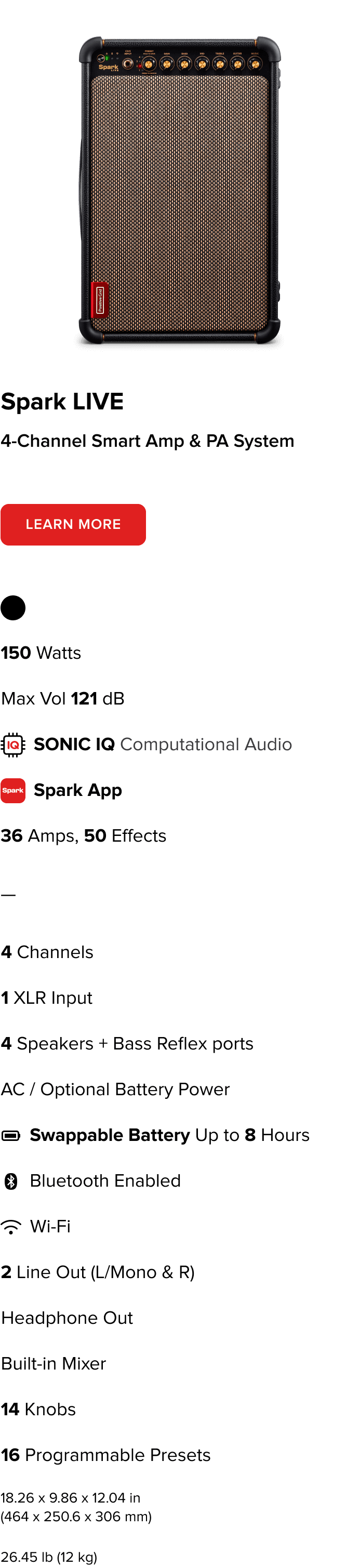 Die ultimative Performance-Maschine. Spark LIVE ist ein intelligentes 4-Kanal-Verstärker- und PA-System für mehrere Instrumente, das die Leistung unseres SONIC IQ Computational Audio für einen adaptiven, elektrisierenden und mitreißenden Sound nutzt. Auf 4 Kanälen bietet es einen überragenden Klang für eine Vielzahl von Instrumenten wie Gitarre, Bass, Gesang, Keyboards und mehr. Das fortschrittliche Lautsprecherkonzept von Spark LIVE ermöglicht die Trennung des gesamten Klangspektrums und das intuitive Mischen zwischen den Kanälen.