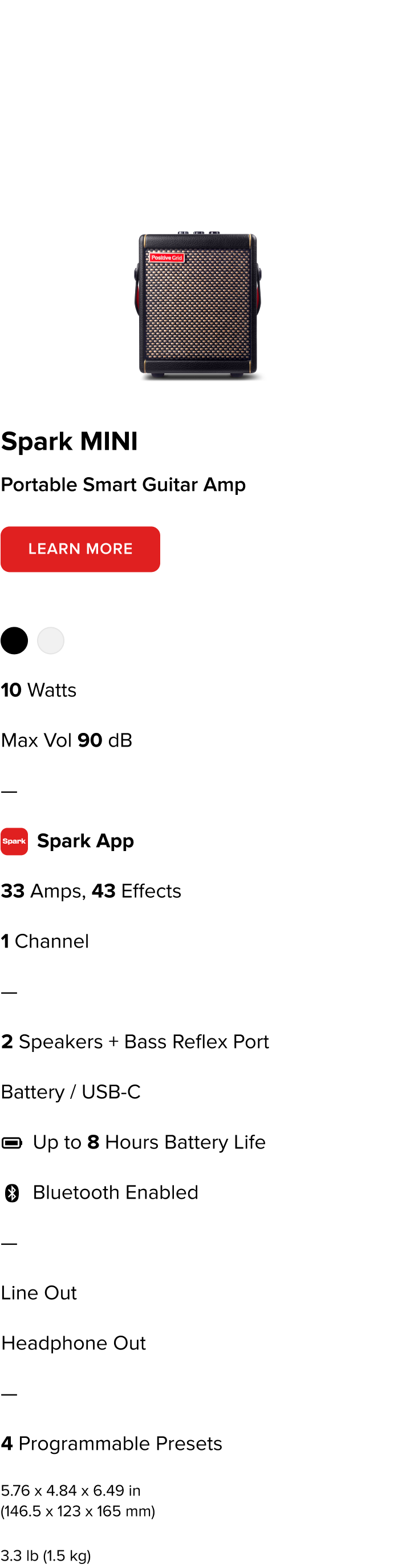 Spark MINI ist ein atemberaubendes, tragbares Kraftpaket, das innovatives, individuell anpassbares, intelligentes Gitarrenspiel für unterwegs ermöglicht. Mit mehrdimensionalem, hochwertigem Sound, einer Fülle von Verstärkern und Effekten, Smart Jam, Videoerstellung und Bluetooth®-Audiostreaming ist es das größte und kleinste Rig aller Zeiten.