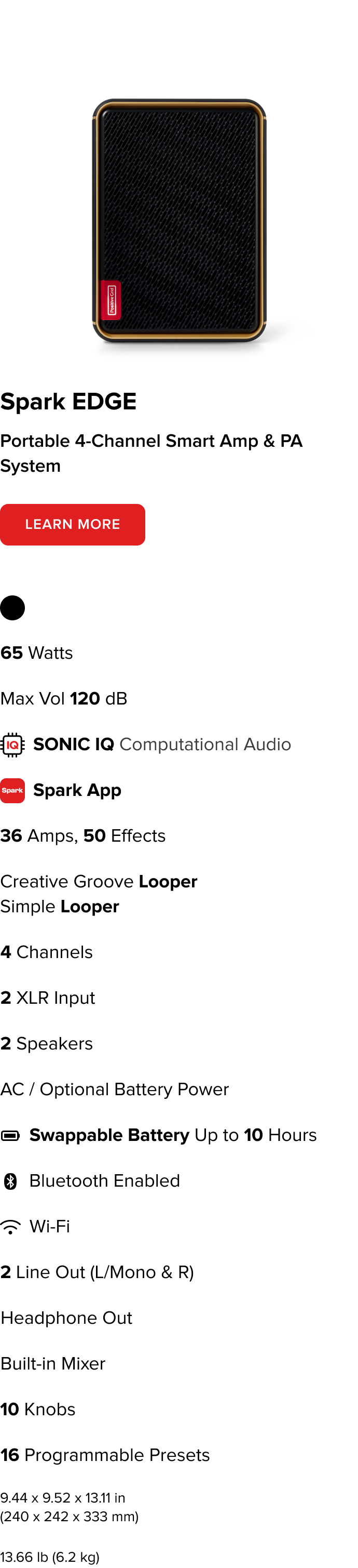 Gehen Sie raus und spielen Sie. Spark EDGE ist Ihre vielseitige All-in-One Performance-Maschine. Dieses 4-Kanal Smart Amp & PA System liefert 65 Watt dynamischen Sound in einem schlanken, tragbaren Design. Mit zwei XLR / 1/4" Combo-Eingängen, optionaler Batteriespeisung (separat erhältlich) und einem integrierten Looper ist Spark EDGE für Musiker gemacht, die immer und überall gehört werden wollen.