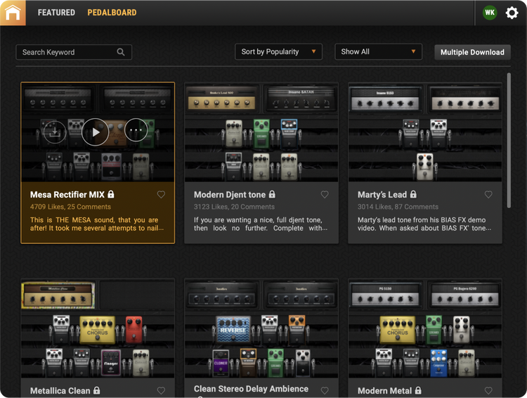 Erstellen Sie den perfekten Sound zum Üben, Jammen und Aufnehmen mit intuitiver Pedalboard- und Signalkettenanpassung und den mehr als 50.000 benutzerdefinierten Sounds, die auf ToneCloud verfügbar sind.