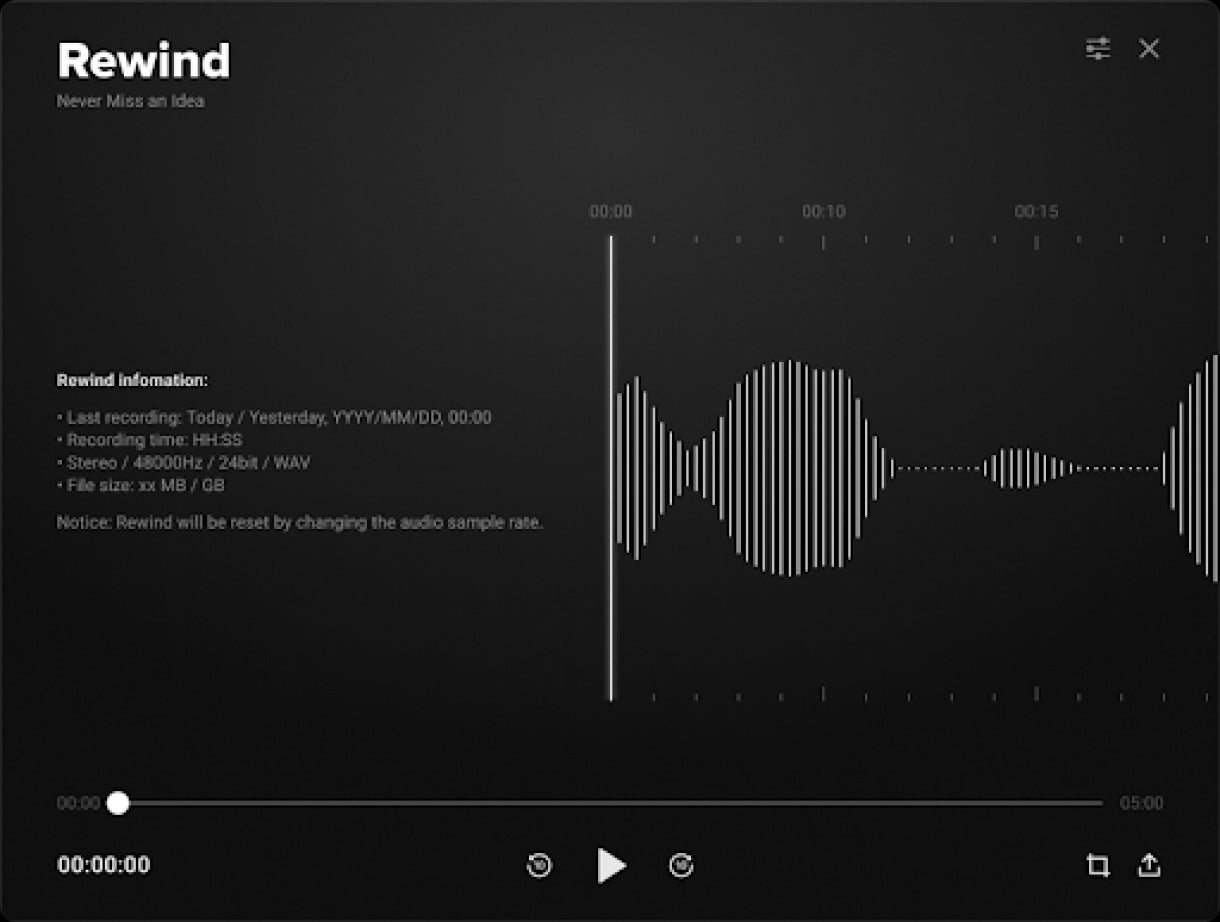 Le rembobinage enregistre automatiquement jusqu'à 10 minutes de votre jeu, ce qui vous permet de ne jamais manquer un moment d'inspiration. Récupérez, découpez et exportez facilement votre riff parfait pour développer vos idées plus tard.