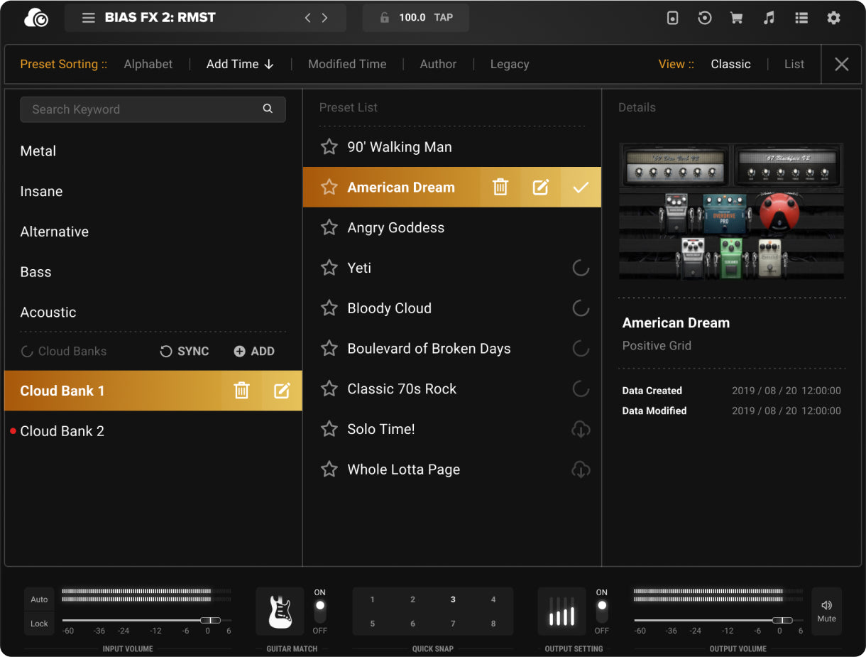 Des classiques vintage d'une valeur inestimable. Des amplis modernes à haut gain. Des basses à couper le souffle et des amplis acoustiques chatoyants. Plus de 100 amplis sont ici. Les modèles les plus appréciés de BIAS FX 2 ont été repensés grâce à notre nouveau moteur DSP méticuleusement détaillé. Les mesures précises point par point et l'émulation dynamique de la distorsion à lampe offrent une structure harmonique riche et une dynamique réactive. De plus, vos versions classiques préférées sont toujours disponibles, de sorte que tous les préréglages actuels restent intacts. Et ce n'est pas tout. Il y a beaucoup plus à venir.