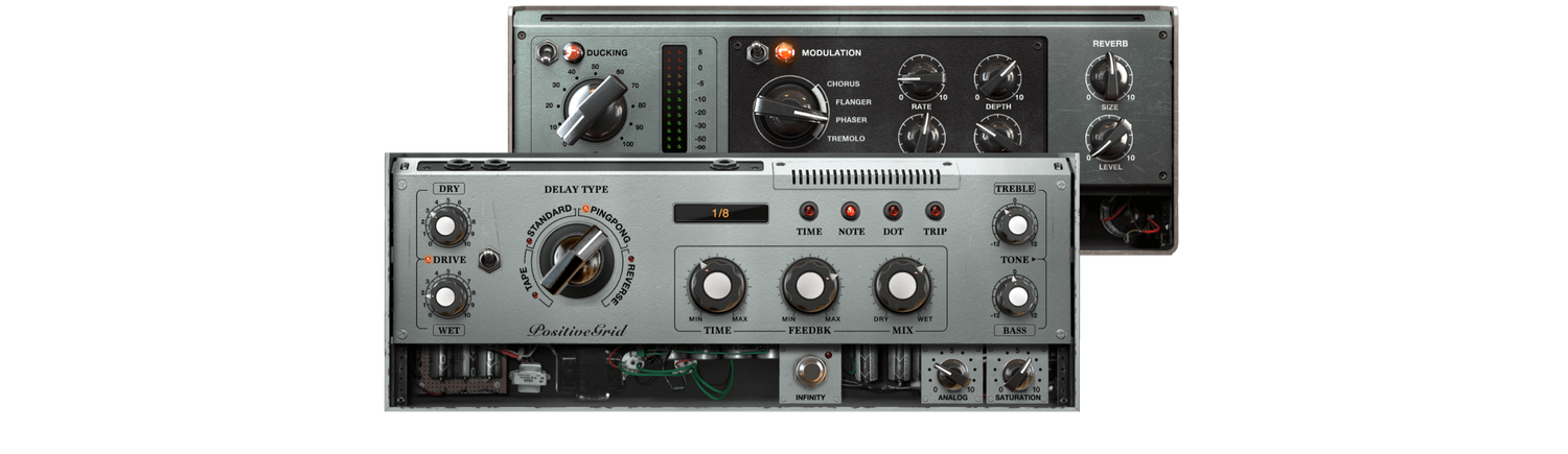 Envoyez votre son de guitare dans l'espace en créant votre propre délai dans BIAS PEDAL. Choisissez l'un des quatre délais pour commencer : standard, ruban, ping-pong et inversé, puis modifiez les paramètres internes pour élargir votre son.